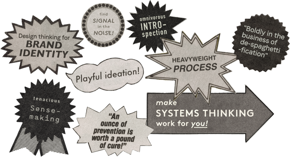 To achieve a lightweight result, we invite our clients into a heavyweight process that balances playful ideation, omnivorous introspection, and tenacious sensemaking.